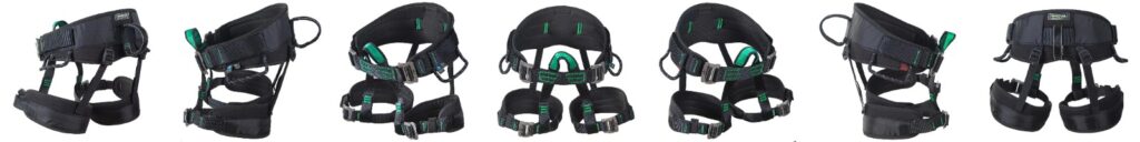 A cadeirinha esportiva (EN 12277 tipo C) é indicada para escalada, rapel e atividades outdoor. O cinturão paraquedista (EN 361) é um cinto de corpo inteiro para sistemas de retenção de quedas no trabalho em altura. Finalidades diferentes – não são intercambiáveis.